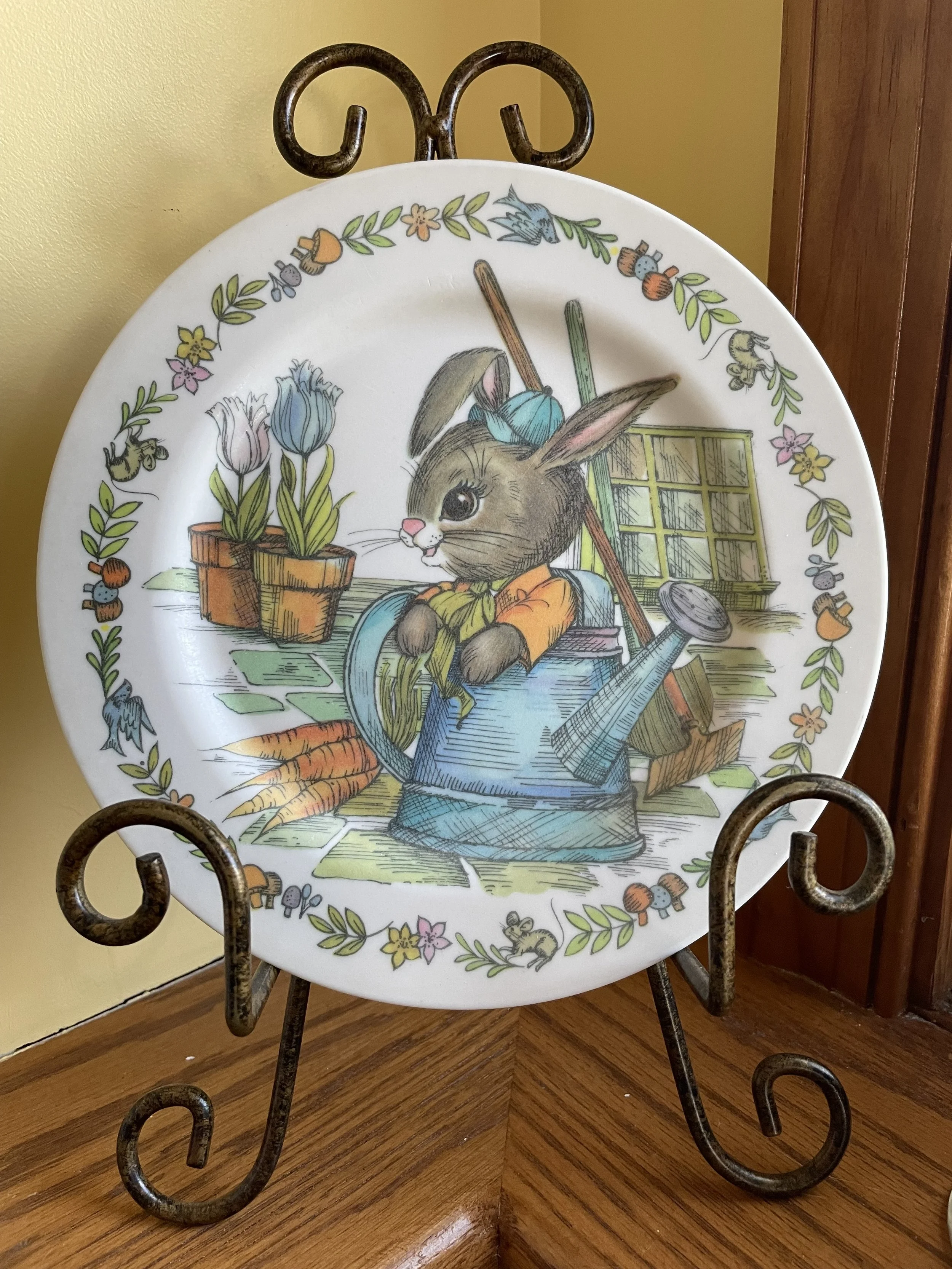 Thinking of the raincoat also reminded me of other childhood treasures like the Peter Rabbit plate that I ate dinner on every evening throughout my childhood. My sister, Rachel, found one of these vintage plates and gifted it to me a few Christmases ago. I have it displayed in my dining room and it makes me smile each time I walk by it. I love the inked lines, the colors, and the whimsy in that little scene.